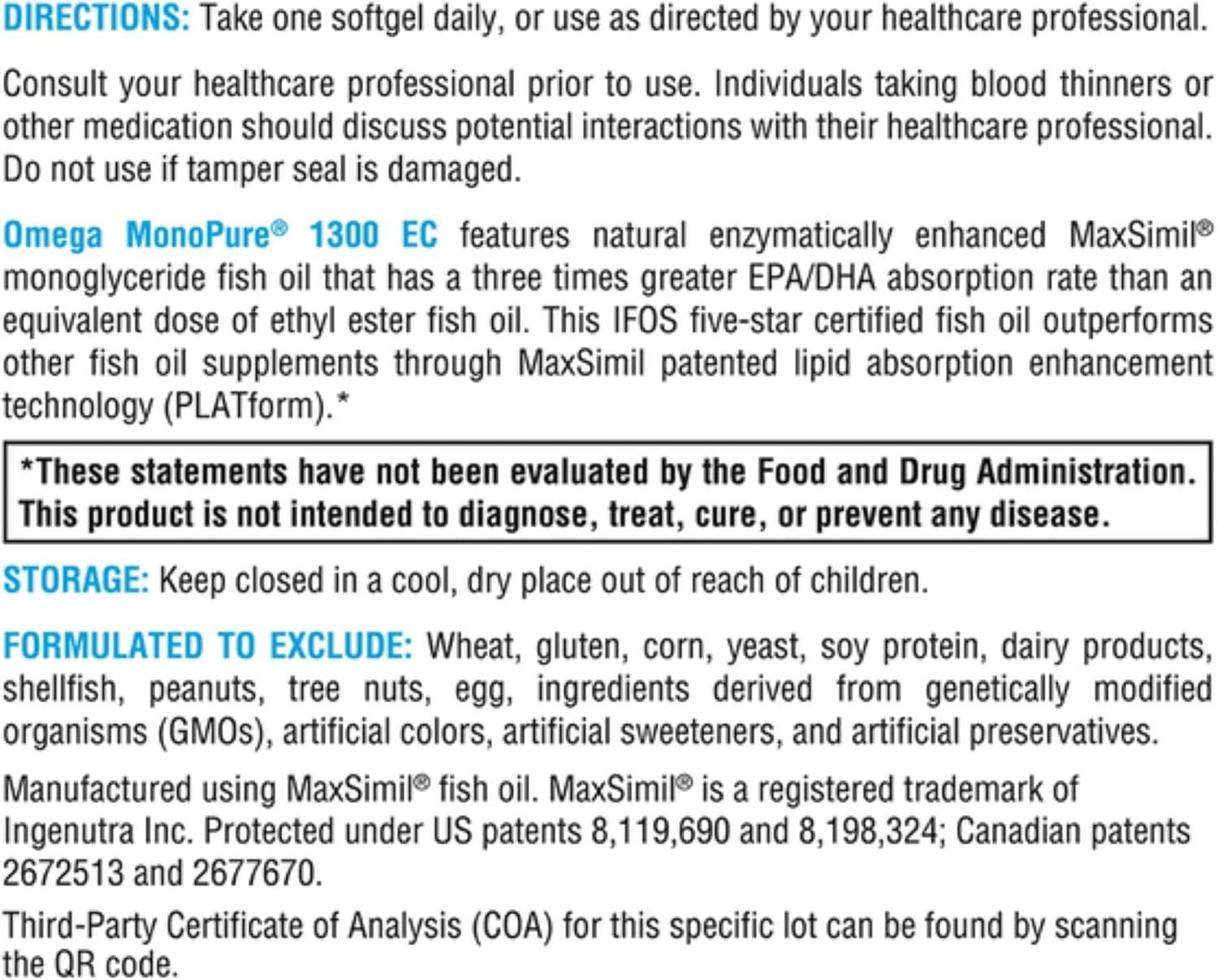 Omega MonoPure 1300 EC Fish Oil Softgels 120 Count – Enteric Coated Omega-3 Daily Balance